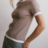 Ringer Tee Style Contrast Trim on Sleeves, Neckline, Hem Short Sleeves Fitted Silhouette Stretch Knit Material Slightly See Through 50% Viscose, 30% Polyester, 20% Nylon Hand Wash Cold, Hang Dry  Model Info Height: 5’7″ Wearing Size: X-Small