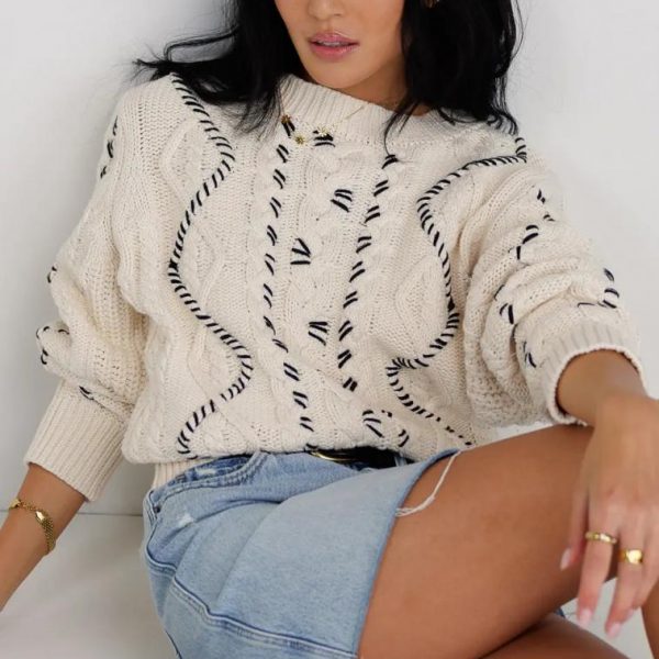 Thick Round Neckline Contrast Stitching Cable Knit Stretch Material  Model Info  Height: 5’8”  Wearing Size: Small  Measurements: Bust: 41″, Length: 20″  **For more specific information on the product, please feel free to email us at webteam@ bohme