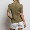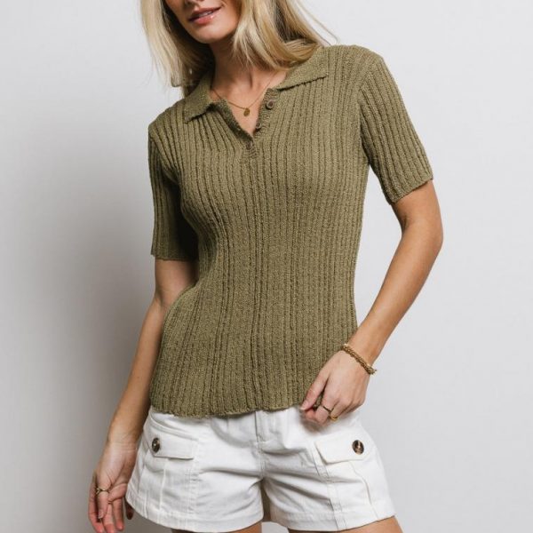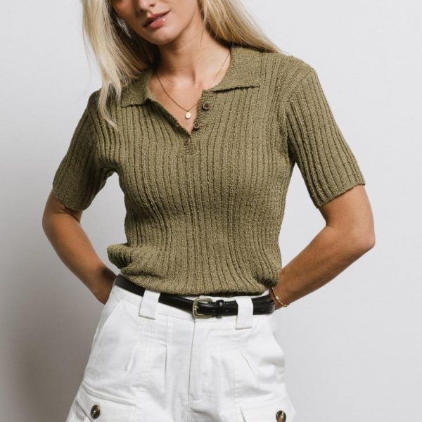 Collared Neckline Three Button Closure Short Sleeves Stretch Ribbed Knit Material 100% Polyester Hand Wash Cold, Lay Flat to Dry Model Info Height: 5’7” Wearing Size: Small