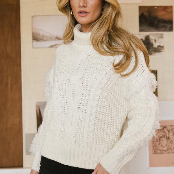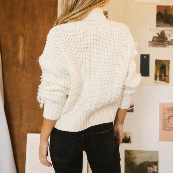 Turtleneck Long Sleeves Fringe Detail on Sleeves Stretch Knit Material 72% Acrylic, 28% Wool Hand Wash Cold, Line Dry Model Info Height: 5’8″ Wearing Size: X-Small