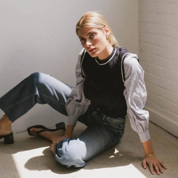 Sweater Vest Bodice Long Striped Sleeves Button Sleeve Cuff Ribbed Neckline, Hem Tie on Sides Stretchy Bodice Non Stretch Sleeves Self: 50% Viscose, 28% Polyester, 2% Polyamide Contrast: 50% Cotton, 50% Polyester Hand Wash Cold, Flat Dry Model Info Height: 5’9″ Wearing Size: Small Small Measurements: Bust: 34″, Length: 19″