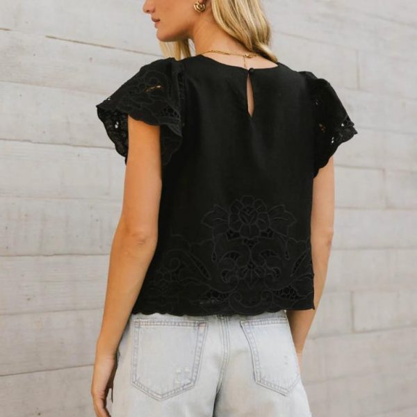 Round Neck Short Flutter Sleeves Back Keyhole Closure Lined Non Stretch Material Embroidered Flowers and Lace Detail Self: 100% Linen Lining: 100% Rayon Hand Wash Cold, Line Dry  The Myra Embroidered Blouse in Black is a must-have for any wardrobe. Its elegant design makes it easy to pair with flowy pants and gold jewelry– ideal for any special occasion. Model Info:  Height: 5’7″  Wearing Size: X-Small