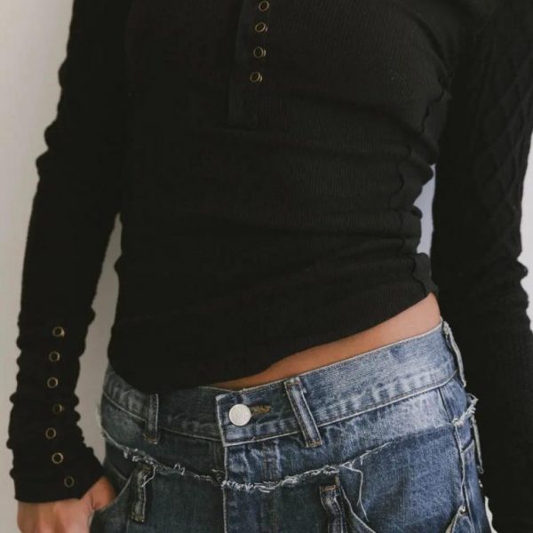 Wide Neckline 10 Snap Buttons Waffle Knit Body Exposed Raw Seams Cable Knit Sleeves Extra Long Sleeves 7 Snap Button Cuffs Body: 62% Polyester, 33% Cotton, 5% Spandex Sleeve: 100% Cotton Machine Wash Cold, Hang Dry  Model Info  Height: 5’9″  Wearing Size: Small