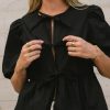 Peplum Style Rounded Neckline Short Puff Sleeves Three Tie Front Closure Non-Stretch Material Slightly See Through 100% Cotton Hand Wash Cold, Line Dry  The confidence that the Natalia Peplum Tie Blouse in Black gives is perfect for formal events. From business meetings to drinks, style this top with a pencil skirt and statement jewelry.  Model Info Height: 5’7″ Wearing Size: Small  Fit: True to Size
