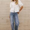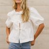 Peplum Style Rounded Neckline Short Puff Sleeves Three Tie Front Closure Non-Stretch Material Slightly See Through 100% Cotton Hand Wash Cold, Line Dry  We absolutely love the Natalia Peplum Tie Blouse in White. This top is an excellent transition piece and glides seamlessly from lunch with your sister, to dinner with your date. Pair with your favorite colored denim. Model Info Height: 5’7″ Wearing Size: Small  Fit: True to Size