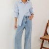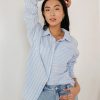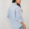 Collared Neck Raw Subtle High-Low Hem 7 Functional Buttons Long Sleeves with Button Cuffs Left Chest Pocket Contrasting Stripe Pattern Oversized Fit Sheer Material 80% Cotton, 20% Rayon Gentle Wash Cold, Hang Dry Dress up or dress down with the Nyah Striped Button Up in Blue. This top is so versatile and we love how many options it offers. Button up and tuck into some skinny jeans for a business casual look. Model Info Height: 5’8′ Wearing Size: Small Measurements: Bust: 44″, Length: 31″ **For more specific information on the product, please feel free to email us at webteam@bohme