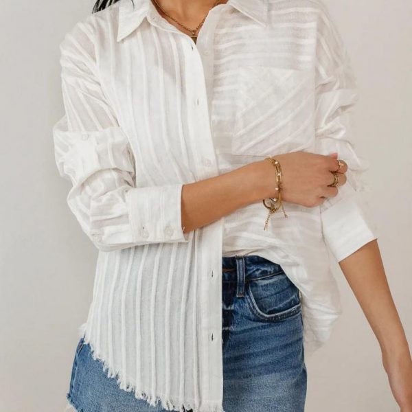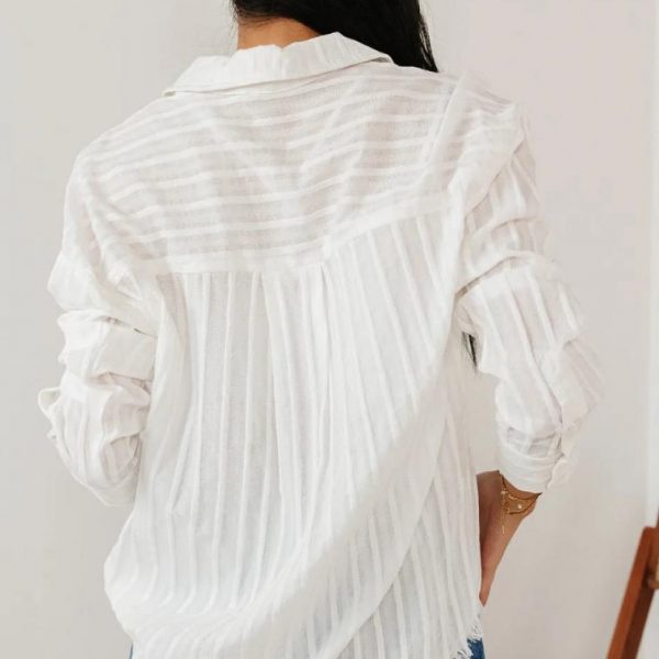 Collared Neck Raw Subtle High-Low Hem 7 Functional Buttons Long Sleeves with Button Cuffs Left Chest Pocket Contrasting Stripe Pattern Oversized Fit Sheer Material 80% Cotton, 20% Rayon Gentle Wash Cold, Hang Dry  The Nyah Striped Button Up in White is the best all-around top. This is the kind of blouse you can dress up for a date or lounge around in at home. Offset the buttons, tuck into some sweatpants and grab a claw clip for an effortless look. Model Info  Height: 5’8″  Wearing Size: Small  Measurements: Bust: 44″, Length: 31″  **For more specific information on the product, please feel free to email us at webteam@bohme