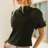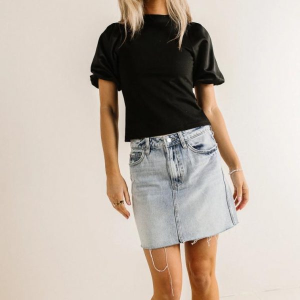 Round Neckline Satin Feel Short Puffed Sleeves with Elastic Cuffs Back Zipper Closure Slight Cropped Fit Mixed Material Slight Stretch Satin Material Self: 60% Viscose, 35% Nylon, 5% Elastane; Sleeve: 100% Polyester Machine Wash Cold, Line Dry Model Info Height: 5’7″ Wearing Size: X-Small