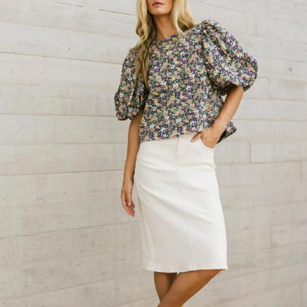 Round Neckline Back Cinch Keyhole Back Tie Detail Short Puff Sleeves Elastic Sleeve Cuffs Fully Lined Self: 100% Cotton Lining: 100% Polyester Hand Wash Cold, Hang Dry Model Info Height: 5’7″ Wearing Size: Small