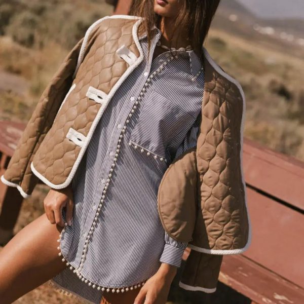 This is a Pre-Order Item, estimated ship date is 9/6/2024. For more information on preorders, click here. Pearl Trim Collared Neckline Eight Button Closure Long Sleeves with Button Cuffs Striped Pattern Wearer’s Left Chest Pocket Scoop High-Low Hemline Non Stretch Material 75% Polyester, 25% Cotton Hand Wash Cold, Hang Dry Model Info Height: 5’8″ Wearing Size: X-Small X-Small Measurements: Bust: 48″, Length: 34″