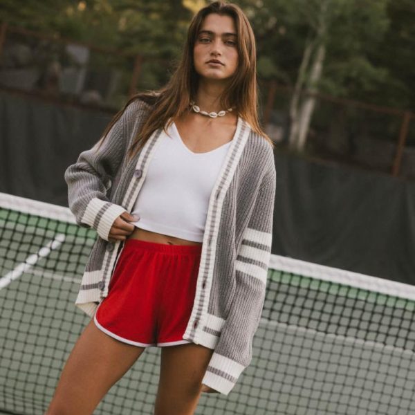 This is a Pre-Order Item, estimated ship date is 9/6/2024. For more information on preorders, click here  V Neckline Four Button Closure Contrast Striping on Hem Contrast Striping on Left Sleeves Ribbed Cuffs, Neckline, Hem Stretchy Material 60% Cotton, 40% Acrylic Hand Wash Cold, Hang Dry  Model Info Height: 5’9” Wearing Size: Small
