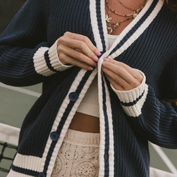This is a Pre-Order Item, estimated ship date is 9/6/2024. For more information on preorders, click here V Neckline Four Button Closure Contrast Striping on Hem Contrast Striping on Left Sleeves Ribbed Cuffs, Neckline, Hem Stretchy Material 60% Cotton, 40% Acrylic Hand Wash Cold, Hang Dry Model Info Height: 5’9” Wearing Size: Small
