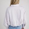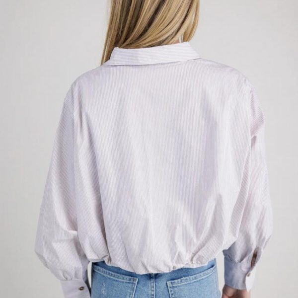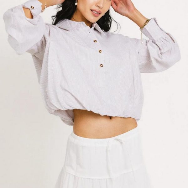 Collared Neckline Long Sleeves with Button Cuffs Five Button Closure Bubble Hem Cropped Fit 100% Cotton Hand Wash Cold, Line Dry  Model Info  Height: 5’8″  Wearing Size: Small