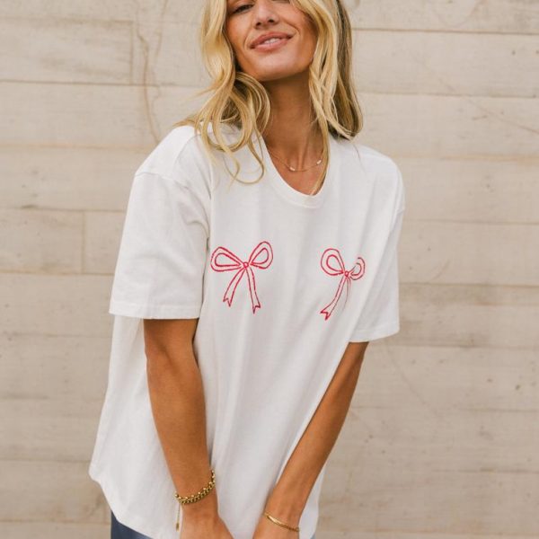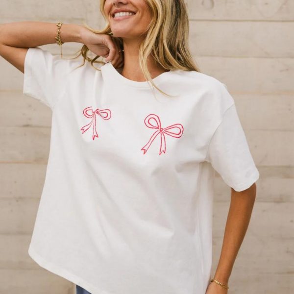 Two Red Bow Graphic Crew Neckline Short Sleeves Slightly See Through Stretch Material 100% Cotton Hand Wash Cold, Hang Dry  Model Info Height: 5’7″ Wearing Size: Small