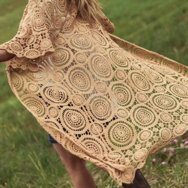 Circular Crocheted Pattern See Through Short Sleeves Slight Stretch Material Midi Length 100% Cotton Machine Wash Cold, Hang Dry Layering Pieces Sold Separately   Calling all free spirits, the Rina Crocheted Kimono in Camel is about to be your boho go-to. This outer layer is the perfect piece for all your warm weather activities from music festivals to picnics in the park. Model Info Height: 5’7″ Wearing Size: One-Size Measurements: Bust: Open, Waist: Open, Length: 47″