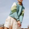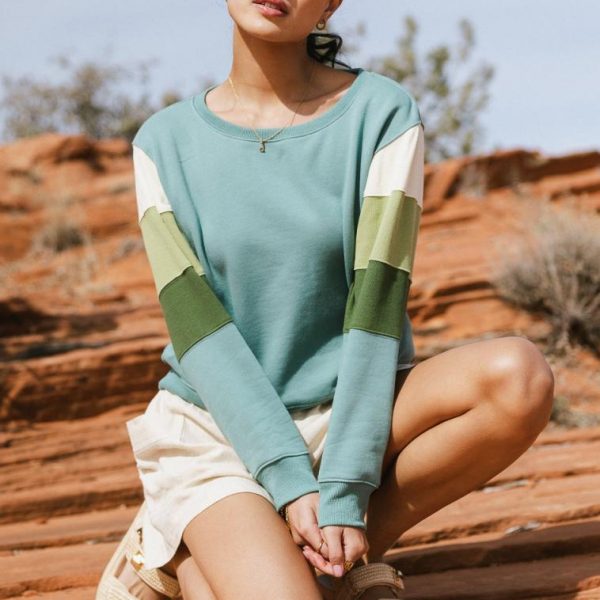 Round Neckline Long Sleeves Color Block Detail on Sleeves Stretch Knit Material Body: 70.8% Cotton, 29.2% Polyester; Contrast: 95.5% Cotton, 4.5% Spandex Machine Wash Cold, Hang or Tumble Dry Low Model Info: Height: 5’8″ Wearing Size: X-Small