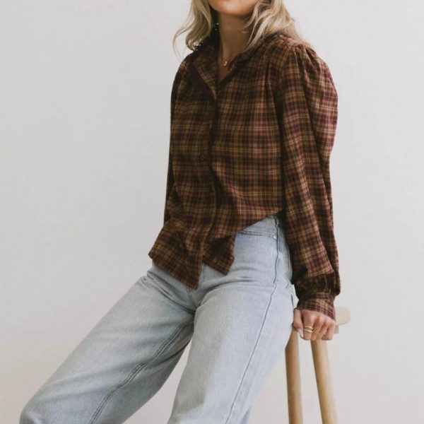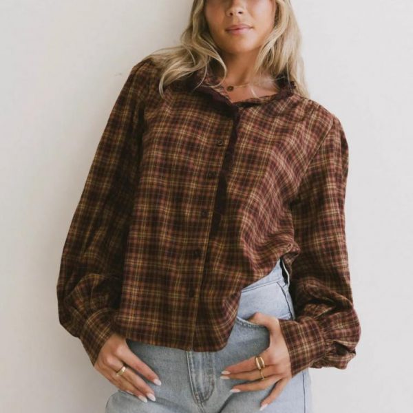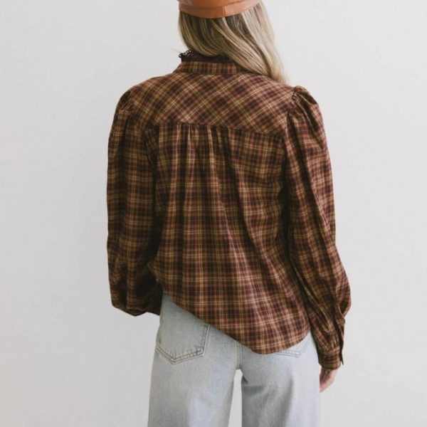 Collared Mock Neckline Eyelet Lace Trim Plaid Pattern Eight Button Closure Long Puff Sleeves Two Button Cuff Non Stretch Material 76% Polyester, 22% Rayon, 2% Spandex Hand Wash Cold, Line Dry Model Info Height: 5’9″ Wearing Size: Small