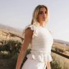 Ribbed Round Neckline Short Flutter Sleeves Stretch Knit Material Ruffled Waist Lined Bodice Self: 100% Cotton Lining: 100% Polyester Hand Wash Cold, Flat Dry  Model Info:  Height: 5’9″  Wearing Size: Small  Small Measurements: Bust: 28″, Length: 20.5″  **For more specific information on the product, please feel free to email us at webteam@bohme