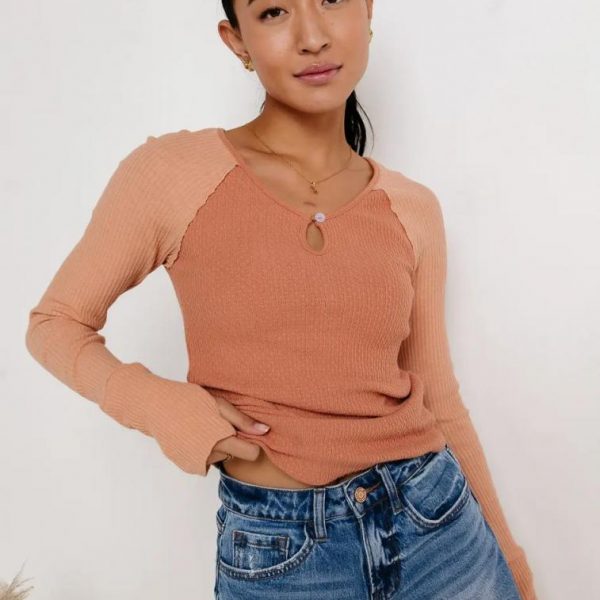 V-Neck Ribbed Long Sleeves with Thumb Holes Stretch Knit Bodice Front Keyhole Cut Out Button Closure Curved Hem Body: 97% Cotton, 3% Spandex; Sleeve: 92% Cotton, 8% Spandex Hand Wash Cold, Tumble Dry Low  Model Info  Height: 5’8″  Wearing Size: Small  Measurements: Bust: 26″, Length: 23″  **For more specific information on the product, please feel free to email us at webteam@ bohme
