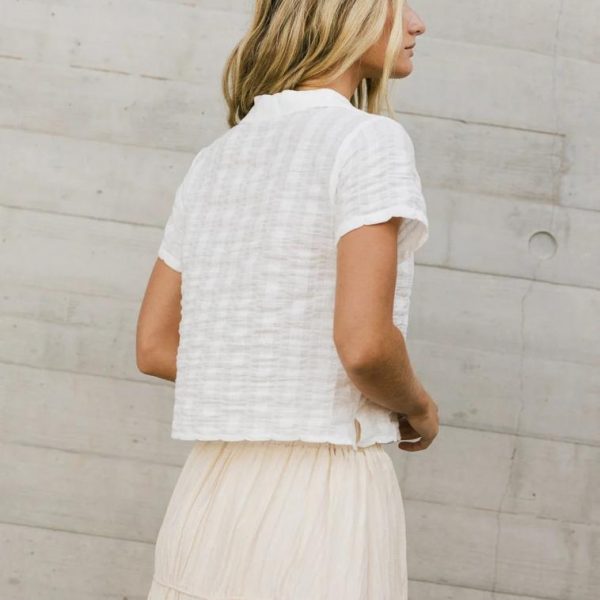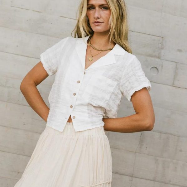 Collared Neckline  Five Button Front Closure  One Chest Pocket  Short Sleeves  Boxy Cropped Fit  Slightly See Through  Slight Stretch Material  95% Cotton, 5% Spandex  Hand Wash Cold, Hang Dry Model Info  Height: 5’7″  Wearing Size: Small