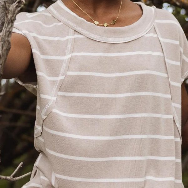 Raw Seam Crew Neckline Raw Seam Shoulder Detail Stretch Knit Material Exposed Serged Seam Cap Sleeve Round Hemline 5″ Slits on Sides 53% Polyester, 42% Rayon, 5% Spandex Hand Wash Cold, Hang Dry   The Theresa Striped Top in Mocha isn’t your average striped tee. This shirt has serged seams that give it an edgier look. Style it with a pair of flowy pants and some strappy sandals.  Height: 5’5″  Wearing Size: Small