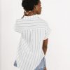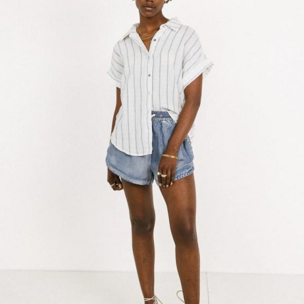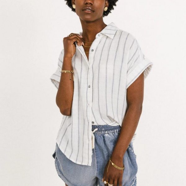Collared Neckline Seven Functional Front Buttons Short Rolled Sleeves Scoop Hemline Boxy Fit Slightly See Through Non Stretch Material 100% Rayon Hand Wash Cold, Flat Dry The Topanga Striped Button Up in White is cool and breezy. Our favorite way to utilize this top is as a layer. Pair with a brightly colored layering piece and leave the buttons ajar to let it peak through. Complete this look with some baggy denim and sneakers. Model Info Height: 5’5″ Wearing size: Small