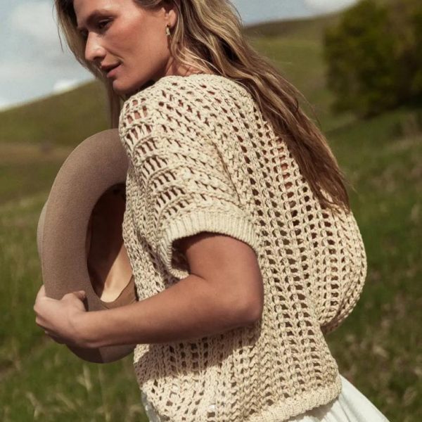 Round Neck Crocheted Bodice See Through Short Batwing Sleeve Oversized, Boxy Fit Ribbed Knit Neckline, Sleeves and Hem Stretchy Material 100% Cotton Hand Wash Cold, Hang Dry  Layer up with the Toso Crocheted Top in Natural. This piece is perfect to throw over a basic top to level up any outfit. Pair with some denim shorts and platforms and you’re set for the summer. Model Info Height: 5’7″ Wearing Size: Small