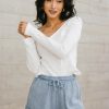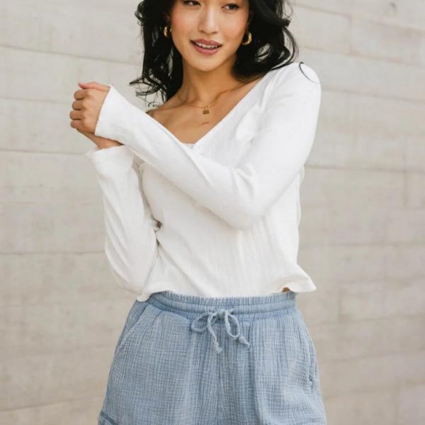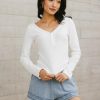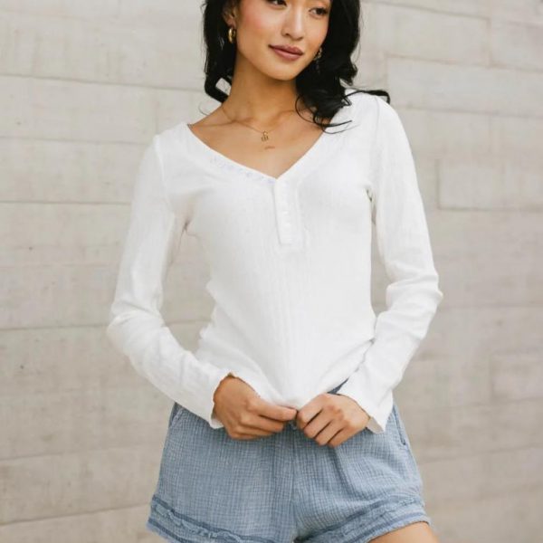 V Neckline Thirteen-Button Detail Stretchy Ribbed Material Long Sleeves Scoop Hemline Zig Zag Stitch Lettuce Hems 100% Cotton Machine Wash Cold, Hang Dry  Model Info Height: 5’8″ Wearing Size: X-Small