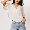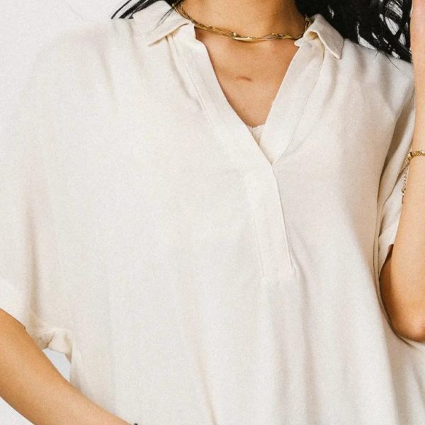 Deep V Neck Collared Neckline Short Batwing Sleeve Back Seam Detail Loose, Boxy Fit See Through Non-Stretch 100% Rayon Hand Wash Cold, Hang Dry Lightweight and airy, the Una Collared Blouse is the top of your dreams. This top leans more towards formal and is perfect for work or a nice dinner date. Pair with a pencil skirt and some flats. Model Info Height: 5’8″ Wearing Size: Small