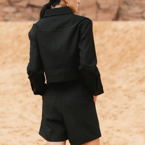 Collared Neck  Long Sleeves with Button Cuffs  Button Up Closure   Two Front Pockets Cropped Fit  Lined  Lightweight Non Stretch Material Shell: 74% Polyester, 20% Cotton, 6% Elastane; Lining: 100% Polyester  Machine Wash Cold, Line Dry  MATCHING PIECES SOLD SEPARATELY Model Info  Height: 5’7″  Wearing Size: X-Small