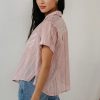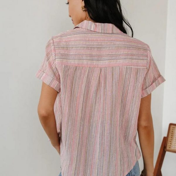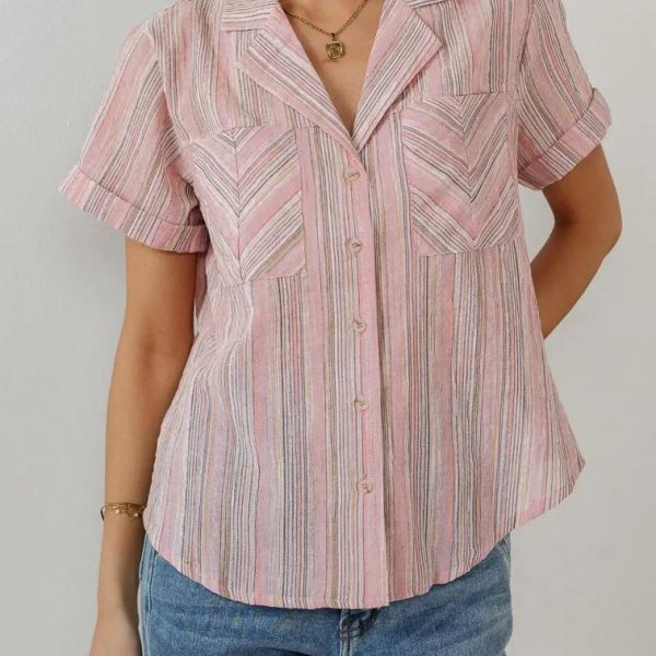 Collared V-Neck Short Sleeves with Rolled Cuff 2 Front Pockets Sheer Non Stretch Material 5 Button Closure 2.5″ Slit on Sides Oversize fit 75% Cotton, 25% Polyester Gentle Wash Cold, Hang Dry  The Wilma Woven Top in Pink can’t be passed up. This top is casual and perfect for summer. Grab some white denim and platforms and you’re set. Model Info  Height: 5’8″  Wearing Size: Small  Measurements: Bust: 44″, Length 26″ **For more specific information on the product, please feel free to email us at webteam@ bohme